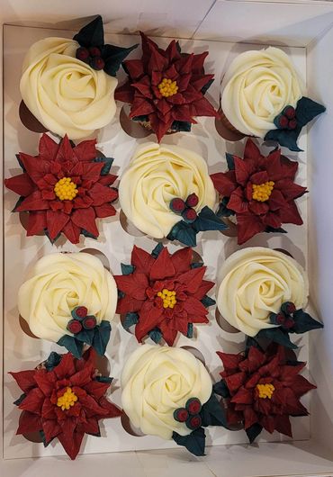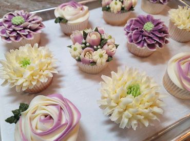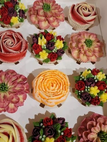 Twelve assorted floral cupcakes. White wedding bliss flavor.